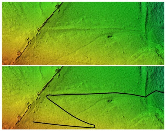 Another advantage of aerial acquisition is related to the LiDAR data obtained at the SL1 of the area surrounding the wall. Thanks to the data obtained in our study, we identified the old path that was historically used to access to the castle by Muslims. This path was known from historical references, although it had not been mapped to date. Our approach allowed the identification of this path (Figure 8) from the DTM obtained at SL1 using LiDAR data, despite the presence of trees in this area (see Figure 1). This path is clearly identifiable, despite the presence of other more recent paths, which are visible in the DTM representation. Therefore, the use of these techniques is justified in this type of study where vegetation is considerable. This identification has made it possible to analyze the interaction of the old path and the wall, including the location of the gates.