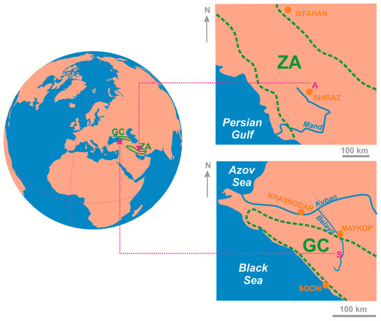 - Adamia, S.; Zakariadze, G.; Chkhotua, T.; Sadradze, N.; Tsereteli, N.; Chabukiani, A.; Gventsadze, A. Geology of the Caucasus: A review. Turk. J. Earth Sci. 2011, 20, 489–544. [Google Scholar] [CrossRef]
