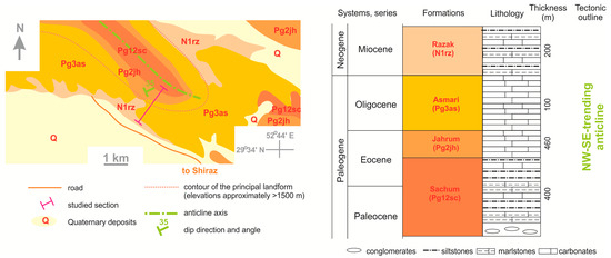 - Babazadeh, S.A.; Cluzel, D. New biostratigraphy and microfacies analysis of Eocene Jahrum Formation (Shahrekord region, High Zagros, West Iran). A carbonate platform within the Neo-Tethys oceanic realm. BSGF—Earth Sci. Bull. 2023, 194, 1. [Google Scholar] [CrossRef]