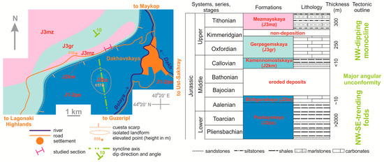 - Rostovtsev, K.O.; Agaev, V.B.; Azarian, N.R.; Babaev, R.G.; Besnosov, N.V.; Hassanov, N.A.; Zesashvili, V.I.; Lomize, M.G.; Paitschadze, T.A.; Panov, D.I.; et al. Jurassic of the Caucasus; Nauka: St. Petersburg, Russia, 1992. (In Russian) [Google Scholar]