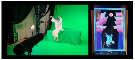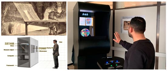 The holographic effect on which our showcase is based is called a Pepper’s Ghost projection []. It is derived from a theatrical technique that creates an optical illusion of reality for the audience (Figure 3) by means of a semi-transparent and semi-reflective surface placed between the audience and the stage. The actor/object is placed in a position invisible to the audience, usually a room below the stage, but he/she/it is reflected on the semi-reflective surface so that his/her/its image appears on the stage together with the real playing actors. It is a mixed reality environment, born in the XIX century. In our case, the theatrical mechanism is replicated with some differences, first of all the reduced size. The actor is replaced by an image projected by a screen.