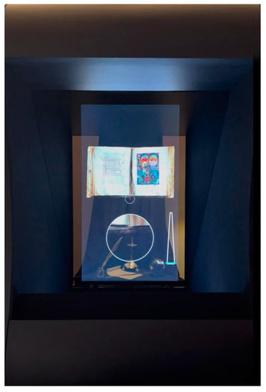 - A small room where two multimedia installations let the public experience two projects more extensively. The first one was dedicated to E-RIHS, the European Research Infrastructure for Heritage Science [], and specifically to the mobile and fixed laboratories, archives, and competences that CNR IPSC makes available to the international scientific community and museums; the second installation was dedicated to Codex4D. Thanks to the most advanced techniques and the holographic showcase, the manuscript became an “alive” and speaking object, engaging the public not only through its contents and meanings, but also through its materials, parchment, inks, and pigments.