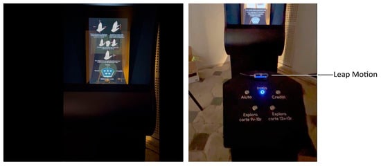 A totem was positioned in front of the showcase, 1 m away, and the user would stand in front of it. The totem has some buttons, useful for starting the experience by selecting a movie. A motion capture sensor allows the user to interact with the 4D models (see video demo []). The Leap Motion sensor [] was used to track the hand movements. The buttons on the totem were equipped with two-colour LEDs programmed to give directions and visual feedback during the experience.