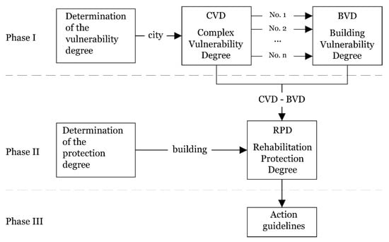 Once the description of each building has been completed with the CVD, BVD and RPD values, in Phase III, the different intervention possibilities are studied along with the application criteria in each case, considering the particular values for each building, and specific conditions or limits may be established for some of its parts or elements that should be reflected in its respective file []. The different intervention proposals put forward should be a fundamental tool for technical personnel of the municipal administration when regulating renovation actions within their responsibilities. Figure 1 summarizes the different phases of the proposed methodology:
