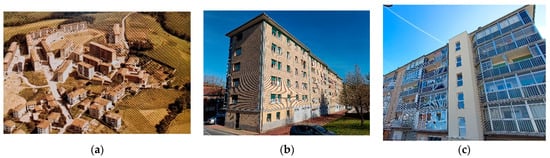 In the same sense, it is significant to note how the possible impact on a building’s compositional and architectural image resulting from action on the enclosure is outside the set of parameters analyzed by different planning tools and regulations [,] when establishing the intervention criteria for achieving improved energy efficiency. In the case of Spain, most strategic plans, such as the urbanZEB project [], the ERESEE program, the Long-Term Building Intervention Strategy of Euskadi [] or the 2014 GTR Report [] take into account three fundamental aspects when conceiving strategies for energy efficiency renovation of residential buildings: architectural description, energy description and financial description. With some variants, the main parameters which all of them take into account when describing buildings’ architecture are as follows: the main use of the building; the type of building; the type of ownership; the number of dwellings; the type of urban planning; the year of construction; the number of floors; and the area of enclosure per dwelling. The combination of some of these parameters defines different scenarios in which data linked to the building’s construction characteristics are introduced, such as the building’s compactness, the overall thermal transmittance of the enclosure, the heat capacity of the enclosure or the rate of airflow infiltrating through the framing. There are exceptional cases in which, for example, a municipal council has issued an ordinance for the sole purpose of preserving whole the appearance of a worker housing complex built in the mid-20th century that was not previously protected, such as the one at Alaberga in Errenteria []. It can therefore be seen that the compositional, typological and aesthetical aspects or those with urban and architectural value which may be affected due to the transformation of buildings’ outer skin are left out of the equation and are not considered when regulating the different kinds of intervention, except in the case of buildings or complexes previously included in protection catalogues for heritage reasons, in which case the different regulations opt for the simplest solution, such as excluding them from any obligation to upgrade their exterior enclosure [].
