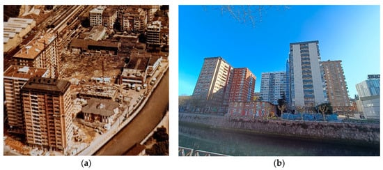Errenteria was until the mid-19th century a rural town. In 1845, the municipality’s industrialization began with the establishment of the first modern factory, the Sociedad de Tejidos de Lino (Linen Cloth Company). The arrival of industrialization led to population growth and gradual urban transformation. Between 1860 and 1910, the number of Errenteria’s inhabitants doubled, while during the following years and until the late 1940s, the wars experienced in both Europe and in Spain led to fluctuations in its industrial, social and urban development []. During the 1950s, there was significant urban development: on the one hand, the new settlement of Alaberga was built (1952–1956), with 563 dwellings and a full program of urban amenities and infrastructures and, on the other, the municipal master plan was approved (1954), based on an old project from the 1920s []. But the municipality’s real transformation began in the 1960s, when it became one of the major urban–industrial centers of the Basque Country. Between 1960 and 1975, the municipality of Errenteria experienced one of the highest population growths in all of Gipuzkoa, rising from 18,642 to 46,329 inhabitants and becoming the third most populous municipality in that territory. During those years, the period of Spanish developmentalism, immigration from other provinces would be a key factor of that increase, which brought profound and irreversible urban, social and economic changes [,,]. The urban growth model during those years would also vary radically. While in the case of Alaberga, the construction of dwellings was accompanied by a series of amenities such as schools, laundry, market and even a chapel, in the new neighborhoods, the massive and virtually exclusive construction of housing blocks prevailed. In the early 1960s, the construction of the districts of Iztieta, Galtzaraborda, Gabierrota and Morronguilleta was approved and began. The main urban developments of the early 1970s would be those of Agustinas, Capuchinos and Beraun, at a record pace of 333 dwellings per year []. The Capuchinos project would comprise 13 towers with 15–16 floors, with a total of 900 dwellings; for its part, the Beraun neighborhood would surpass all imaginable figures and accumulate more than 2,100 dwellings constructed according to the same building typology.