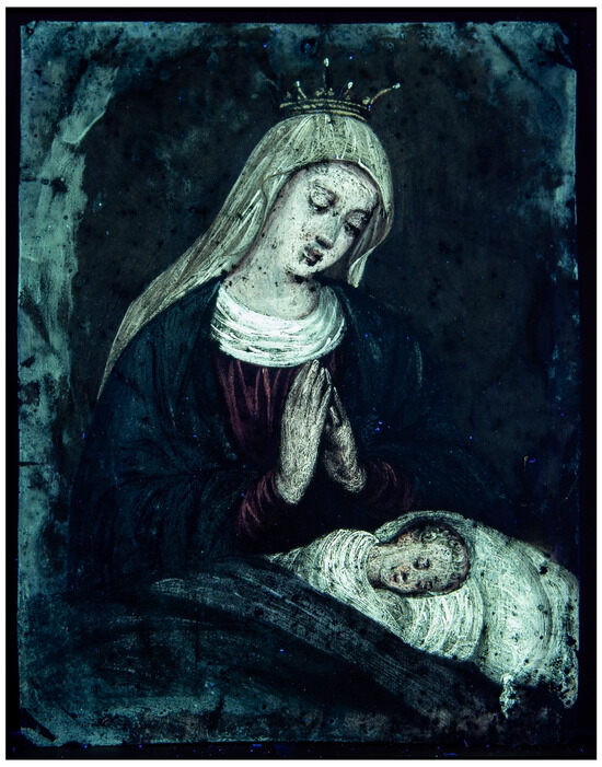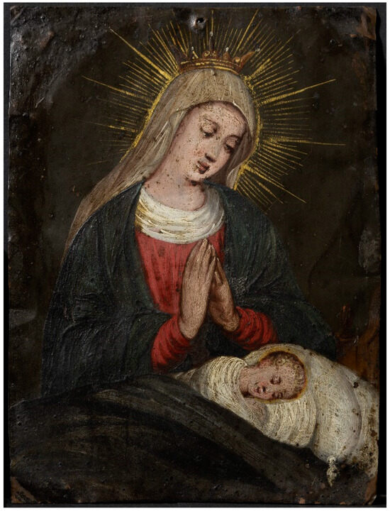 From the point of view of the composition, the painting analyzed recalls the works of the Flemish engraver Hieronymus Wierix [6,7,8] made before 1619 and stored at the British Museum of London [9]. The Wierix work, which revisited the iconography of the Virgin Mary contemplating her son repeatedly, was probably the inspiration for the anonymous painter.