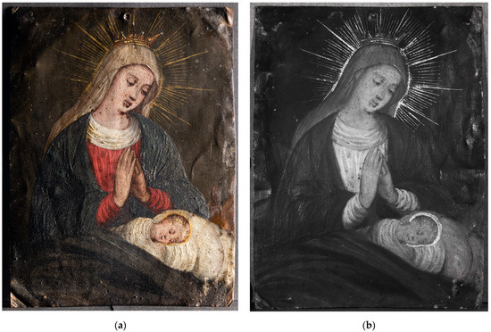 The hypothesis of the presence of this varnish as an original layer on the entire surface was excluded, due to the technique used for the painting. The use of copper as substrate, combined with an oil medium, immediately gave a shining aspect to the surface. The most likely scenario is that the varnish was applied on the entire surface, following a restoration procedure, and then partially removed, probably due to its degradation. Finally, the varnish could have been applied only on the edges to restore and prevent the falling of the painting layer. The UVL also excluded the presence of organic lakes, such as madder lake, which might have been used as a finish layer for the Virgin’s robe, lips, or cheeks (Figure 5).