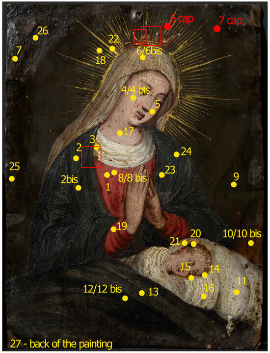 The combination of data obtained through the techniques described in Materials and Methods allowed for the identification of almost all the pigments used by the artist, and the mean thickness of the paint layers, increasing the knowledge of the technique used with this peculiar support. In Figure 3 all the measurement spots and map areas acquired are indicated.