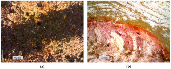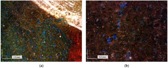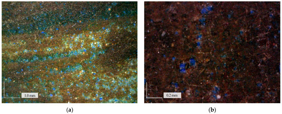 Observing the Virgin’s mantle and the blanket on the bed, they seemed to be painted in a dark blue and in a grey color, respectively. Upon closer investigation, both surfaces appeared to have been achieved using a blue pigment. In particular, the mantle, in addition to the blue pigment, showed altered compounds ranging from green to brown, distinguishable under microscopic observation. On the contrary, the blanket showed only a thick brown layer containing many blue crystals (Figure 4).