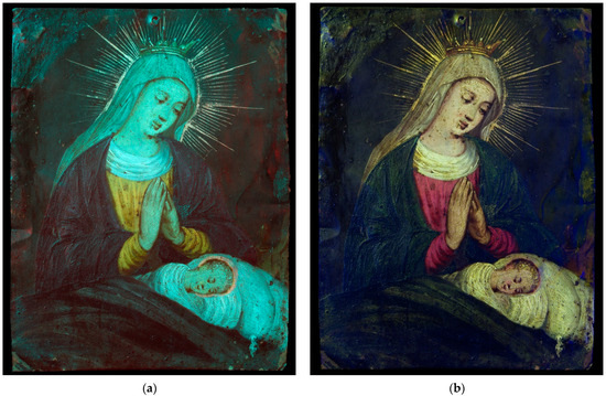 A first indication of the pigments used in the painting was provided by the study of near-infrared reflected false color (IRFC) and ultraviolet false color (UVFC). With both techniques, it was possible to recognize the use of vermilion for the Virgin’s vest and for the lips (yellow/orange in the IRFC image). In the IRFC image, the skin appeared with a slight yellow hue suggesting the use of vermilion as a red component. The presence of a dark color on the Virgin’s mantle implies the probable use of Azurite as a blue pigment. The UVFC observations were in accordance with what was revealed by IRFC (Figure 6).