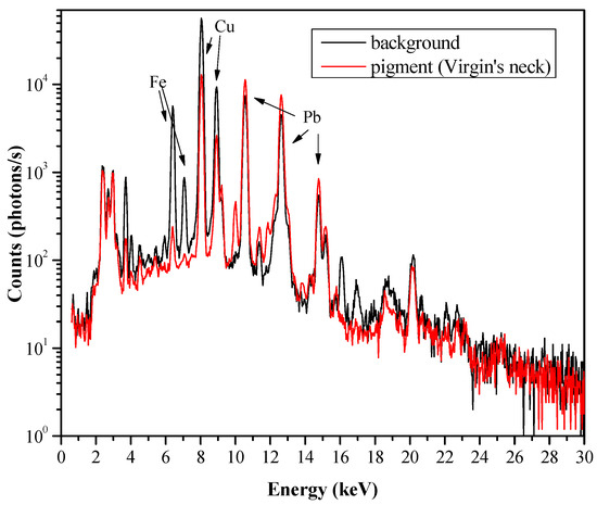 XRF spectrum of a flesh tone (Virgin’s neck) compared to the background. The background exhibits higher iron and copper contents, whereas the pigment shows a higher lead concentration.