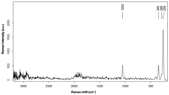 Flesh tones were obtained with a mixture of vermilion and lead white as suggested by the XRF spectrum where mercury and lead were the main elements present. In particular, the lead counts were higher than in the background, suggesting the use of lead white also as a white pigment in the paint layer (see Figure 7). The Raman spectrum showed the presence of vermilion with a strong band at 255 cm−1 and bands at 285 and 345 cm−1 in accordance with the literature [46]. A band at 1052 cm−1, attributable to the ν(CO32−) of lead white, was also detected (Figure 8). The ER FT-IR spectrum, instead, showed only bands that could be assigned to lead white.