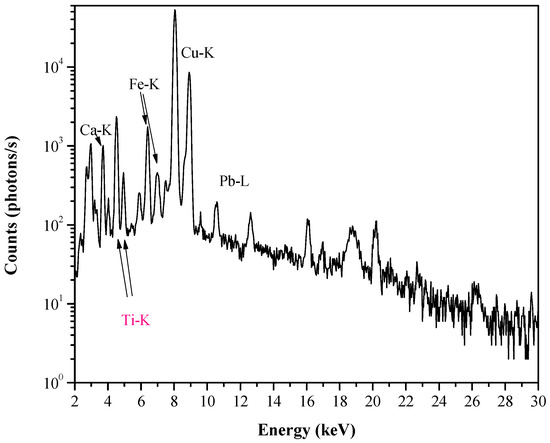 The case of both of the cheeks was different, where two retouched areas were highlighted in the MBI images and documented by the microscope. The XRF measurements coupled with Monte Carlo simulations on these retouched areas showed the presence of titanium, iron, and copper as the main constituents, while mercury and lead were completely absent (see Figure 9). Moreover, the lead content in the preparation layer was lower than in other areas. This confirms the presence of some retouching using titanium white (TiO2) and iron oxide (Fe2O3), with the removal of almost all of the preparation layer. The thickness of the layers, with a very low density indeed, was, respectively, 420 μm for the painting layer and 10 μm for the preparation layer.