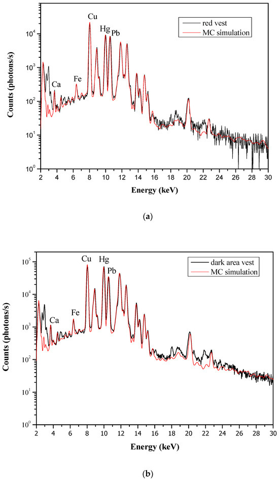 The Monte Carlo code used here is a fast one named XRMC [20,21], based on the Xraylib atomic database [22,23]. It can produce a spectrum with quality comparable to that measured in less than 20 s when running on a standard laptop. A more complete description of the Monte Carlo technique applied to cultural heritage can be found in [24]. The main advantage of using a Monte Carlo simulation, besides the possibility of simulating complex structures, lies in the absence of the need to remove the background from the X-ray spectrum in order to estimate the areas of the peaks, as required by standard quantitative techniques such as the aforementioned fundamental parameter method. Background removal implies the use of analytical methods, such as fitting functions or other mathematical operators [25,26,27]. As a result of the removal process, the peak areas superimposed on the background can be altered, potentially leading to incorrect, either overestimated or underestimated, values for the corresponding chemical element. The error in estimating the background beneath the peak affects smaller area peaks, which correspond to chemical elements with lower concentrations, reducing the minimum detectable concentration. For this reason, even with portable XRF instruments, the use of a Monte Carlo simulation with XRF measurements allows for an improvement in the detection limit, from about 100–200 ppm down to about 20 ppm depending on the chemical element considered. Regarding the error in the estimation of the chemical contents, it depends not only on the error in fitting the X-ray spectrum, but also on the error in the values of the atomic parameters used for quantification. As a rule of thumb, it ranges from 2% to 10%, where the worst values are for the low concentration elements and/or for the external fluorescence line, i.e., from M-lines onwards. To validate the performance of the Monte Carlo software (ver. 6.4.1), we evaluated it by comparing it with another Monte Carlo code that has been tested in simulating experimental measurements of certified samples [24].