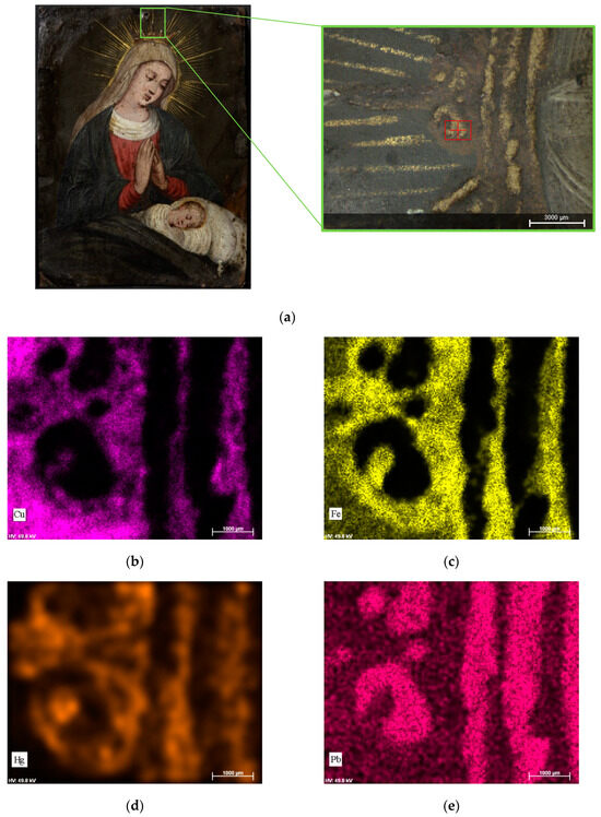 The analyses acquired on the painted surface showed the presence of lead in each measure. The ubiquity of the lead suggested the use of a ground layer formed by lead white and oil as described in the literature [10,45] to isolate the paint layer from the copper substrate, avoiding corrosion phenomena.