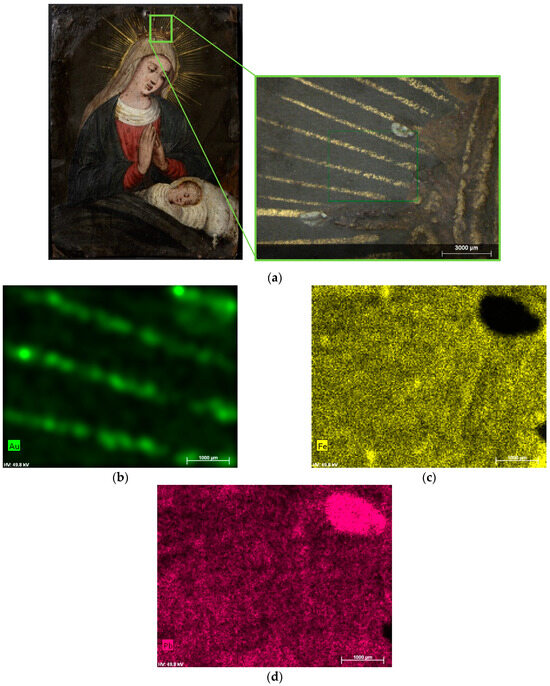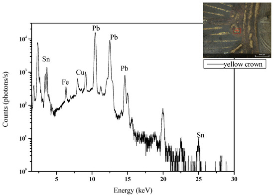 To obtain information on the distribution of elements in the tiny decorative areas, μ-XRF with M4 Tornado (Bruker, Ettlingen, Germany) was used. The X-ray Rh tube can operate between 10 and 50 kV and 100–600 μA, with the option to also choose a polycapillary lens to obtain a spot size down to 25 μm. Detection of fluorescence radiation was performed by an energy-dispersive SDD with a sensitive area of 30 mm² and an energy resolution of 142 eV for Mn Kα. The analysis was conducted under vacuum conditions (20 mbar) to collect X-ray fluorescence from elements with low atomic numbers, at 50 kV and 30 μA. The instrument also allows for the acquisition of maps of selected areas. The maps were acquired with a scan resolution of 600 × 600 pixels. No primary filter was used, and acquisitions were set to 300 s. In this case, Monte Carlo simulations were not applied due to the absence of a model for the polycapillary lens and, more importantly, because the error in the focusing distances of the instruments was of the same order of magnitude as the maximum distance of origin of fluorescence photons. Thus, a multilayer structure would have been unhelpful.