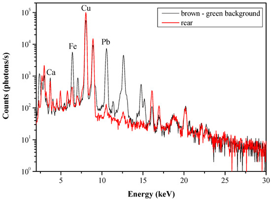 XRF spectrum of the brown-green background compared with the XRF spectrum of the rear.