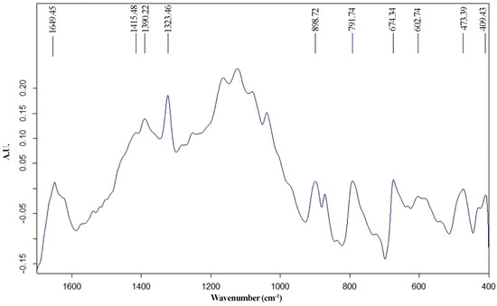 The spectrum also showed small bands at 1620 and 1324 cm−1 due to the presence of calcium oxalate and at 1420 and 670 cm−1 attributable to lead white [40,41,42,43].