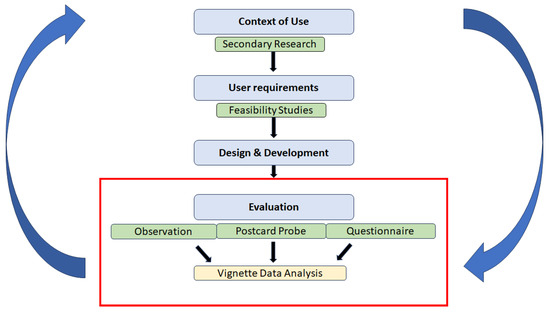In this project, a user-centered methodology is applied, incorporating a multifaceted approach that encompasses observational techniques, surveys, and postcard probes for comprehensive data collection and a vignette approach for data analysis. This holistic methodology (see Figure 7) ensures a rich and nuanced understanding of user interactions, preferences, and feedback, contributing to a more thorough analysis and meaningful insights for the project’s objectives. The following sections detail the observation, structured surveys, and the innovative use of postcard probes to capture a diverse range of user experiences and perspectives.