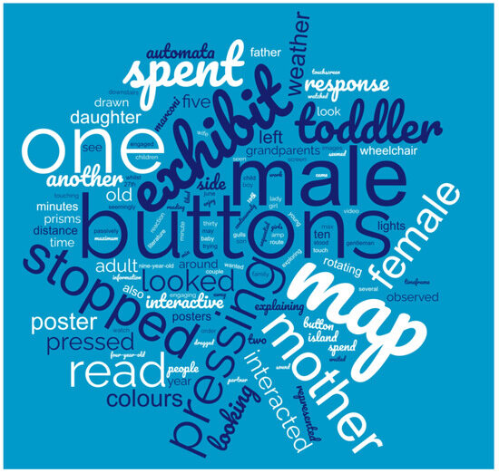 A range of data were collected during the three studies. From the onset, it is important to note that a culture of transient interactions was mainly observed in the museum across all the exhibits. This was evidenced during the observational study on 27 May 2022, as it was a parent and toddler session so parents and grandparent’s main priority was to run after and mind their toddler/toddlers. Therefore, there was little time for them to stop and fully interact with the exhibit. Saying that, it is clear from the observation that both adults and children were drawn to the interactive map section of the exhibit and in particular to the buttons. The words buttons, pressing, and map feature quite dominantly in the data collected during this study (see Figure 8). They seemed to like to press the buttons that triggered the display of data on the various species/areas of the map. However, it was observed on many occasions, that the participants wanted instant feedback from the pressing of the buttons. As it is currently designed, the buttons light up an area on the map that represents a flora or fauna and then it plays a short animation of moving lights and colours to present the high, medium, or low count numbers for that choice. The participants being observed seemed to press one button after another expecting it to change instantly. In hindsight, audio cues here might have been effective to further support the participant in understanding the state of the animation/button press.