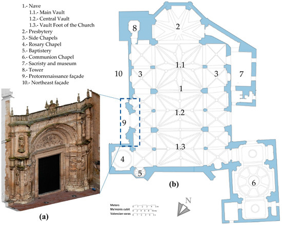 At the end of the 17th century, the Communion Chapel was built at the foot of the church (indicated as 6 in Figure 2). The Communion Chapel, one of the most beautiful pieces of Valencian Baroque, was designed by Juan Bautista Pérez Castiel in 1688, executed by his brother Vicente Pérez Castiel, Antonio Pons and Bertomeu Mir, and completed in 1694 [21].