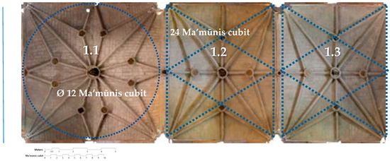 The vault located further south (numbered 1.1 in Figure 3) is made of carved stone with ribs in the shape of an eight-pointed star and, in plan, corresponds to the proportion “ad quadratum” [24,25,26]; its side measures 10.08 m, which does not belong to the Valencian Gothic, according to Zaragoza [26]. This figure corresponds exactly to 24 cubits Ma’mūnis, the usual measurement in the Almohad period, which corresponds to 42 cm [27,28]. The other two vaults have a rectangular plan, the proportions of which are obtained ad triangulum from the 24 cubits Ma’mūnis, and they are built with a vault with stone ribs forming tercelets. In the aisles, there are six ribbed vaults on each side.