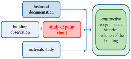 Until now, hardly any studies had been carried out on this building [1,2,3,4,5], which is why this work provides new data on its constructive evolution and its current state of conservation. The study has been based, on the one hand, on the research, compilation and analysis of written documentation, and on the other hand, on the in situ reconnaissance of the building, analysis of the masonry and its materials, and the comparative study of the deformations and anomalies obtained by means of point clouds, applying LiDAR (Light Detection And Ranging) technology and photogrammetry (Figure 1).