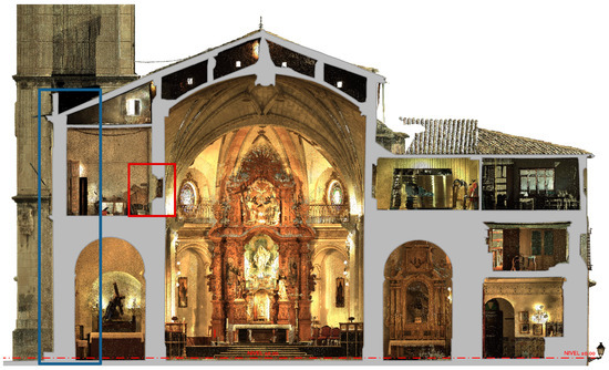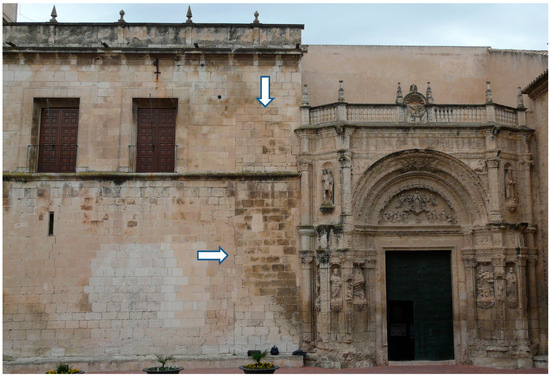 As we have seen above, the Proto-Renaissance doorway and the Late Renaissance chapels located to the northeast of the building were built attached to a masonry belonging to an old tower. Figure 6 shows the perfectly rectangular shape of the walls coinciding with the structure of that tower. This wall is the oldest construction element of the present building and therefore of this façade.