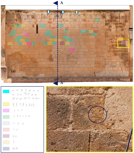 (a) Northeast façade of the church with ashlars coloured according to the type of stonemason marks, in the attached table. (b) Inside the circle detail of a mark that coincides with those of the Gothic church of Jávea (Alicante).