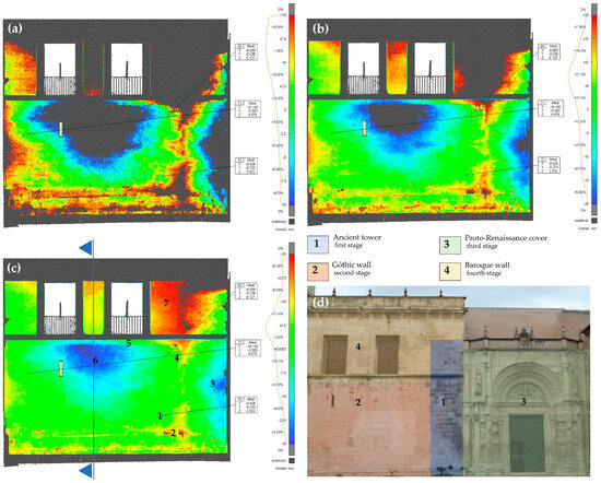 Regarding the degradations, as we have seen in Section 3, the materials used in the construction of this façade are very porous and mainly of a limestone nature. The lower part of the wall shows multiple areas of red or black colour in the study of colour gradients, depending on the distance from the reference plane. This indicates distances greater than 3 cm from the reference plane. In Figure 9c, the area affected by the effects of capillary rising damp has been indicated as “2”.