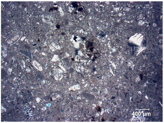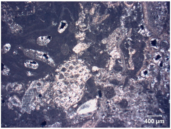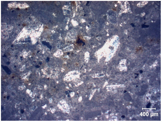 It is a white fine-grained biocalcarenite with high matrix content (biomicrite limestone). Fossil content corresponds to foraminifera and fragments of shells and echinoderm plates (according to POM observations) (Figure 10). Terrigenous content is low (<3%) and corresponds mainly to quartz, with trace contents of feldspar, opaque (dendritic structures) and clay minerals. According to XRD analysis, the mineralogical composition of this rock consisted of 95% calcite and 5% quartz.