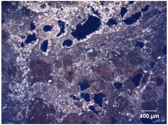 According to the observation carried out at POM, it is a fossiliferous limestone with high matrix content (biomicrite) and a certain reef character (colonies of red algae and bryozoans). It has abundant intraparticle porosity mainly associated with bryozoan components (Figure 12). Pores appear partially filled with a druse calcite cement (sparite). According to XRD analysis, the mineralogical composition of this rock consisted of 94% calcite, 3% quartz and 3% microcline.