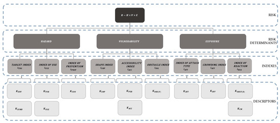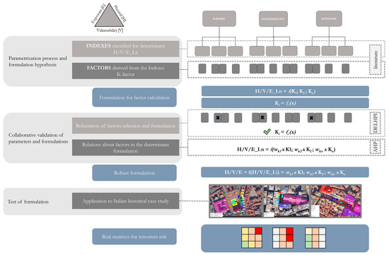 - The parametrization process and formulation hypothesis where factors to be considered in the terrorism risk assessment for uOAs, and their qualification in terms of association with the risk determinant (Hazard, Vulnerability, Exposure) is identified. That is, it starts from the first results discussed in [12,18] for specific boundary conditions of the matter (attack types and the relevance of building and place usage) (Section 3).