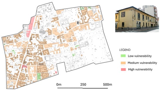 A second example is carried out in Desio town (MB) (Figure 2), where the second rapid assessment method, based on fragility curves, is also used. The example presented here illustrates that the methodology was carried out in the historical center of the municipality of Desio (MB). The town of Desio, in the Lombardy region, is in an area considered by the Italian Design Code as a medium-low seismicity zone [21] (seismic zone 3), as for Caravaggio (Figure 1). The historic town center is characterized by a very simple structural typology in brick masonry: a two-story building with an average height of 3 m per floor. This typology represents around 63% of the building stock despite the size of the town (41,646 inhabitants) and its mainly industrial character. This building typology is widely found throughout the Lombardy region and, therefore, can be taken as an example that can also be extended to Lombard areas with higher seismicity, such as the areas of Brescia on Lake Garda (seismic zone 2). Compared to the case of Caravaggio, other data from CARTIS have been added here in the score attribution (Table 1): some negative (the high presence of openings on the ground floor and the presence of cornices and balconies on the street) and some positive (the non-presence of the items selected as negative, such as the low percentage of openings at ground-floor level and the absence of cornice and projecting balconies along passage roads).