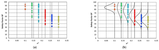 Evolution of the safety factor SF as a* varies. (a) Discrete representation of the values obtained from the sample of buildings S; (b) Probabilistic modeling of each dataset for each value of a* with an appropriate PDF [23, modified by the author].