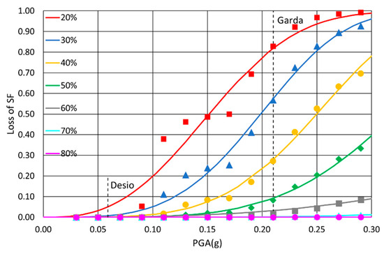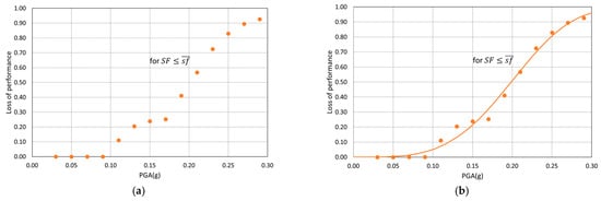 The next step was the construction of the fragility curves describing the probability of exceeding selected thresholds of loss of the SF factor as the PGA, a*, varied. Figure 8 shows the fragility curve evaluated for the threshold ≤ 20%, i.e., what is the probability that for a given PGA value, the building loses 20% of its performance measured in terms of SF.