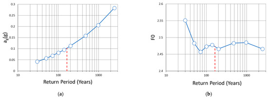 Graphical representation of the trend of the spectral parameters ag (a) and F0 (b) for the Lake Garda area. The circles correspond to the values of the Italian code. For return periods different from those in Table 2, it is possible to obtain the spectral parameters through linear interpolations of the code values. The values of ag and F0 associated with a return period of 164 years are shown in red as an example.
