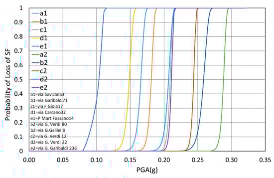 Figure 8 shows a very similar trend of the fragility curves for all buildings, which means a good homogeneity in the mechanical characteristics of the buildings. However, the loss of performance occurs for different PGA values for the set of buildings analyzed; this variation in behavior is certainly due to the organization in the plan of the buildings, i.e., the presence or absence in the plan of bracing walls in the x and y directions.