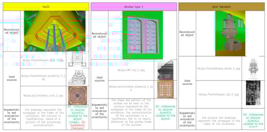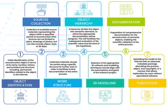 Firstly, published files need to be accompanied by an appropriate set of metadata, which will increase data findability on the web [31]. In order to reduce the difficulty of describing the model, the SRM methodology seeks to use ready-to-use solutions and, although many metadata standards for digital heritage have already been developed [32,33], the field of source-based digital reconstructions remains unsettled. Nevertheless, attempts are being made to harmonise and develop a shared standard for the exchange of metadata. The current results already allow for the development of a prototype schema that can be used in practice [34].