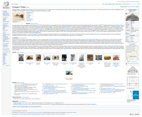 The example of the Wołpa Synagogue clearly shows that the majority of the (secondary) cultural heritage does not yet have any identifiers from the renowned initiatives of the German Integrated Authority File (GND), the controlled vocabularies of the Getty Foundation, or the Virtual International Authority Files. This is where the great advantage of the Wikimedia Foundation’s Open Science approach with the major heavyweight projects Wikipedia and Wikidata comes in [5,6]. Here, objects such as the synagogue in Wołpa can be recorded for the first time and given a unique identifier. In addition, clear human and machine-readable statements can be made about the object.