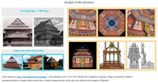 - ‘Synagoga w Wołpie’. Wikipedia. 2023. Available online: https://pl.wikipedia.org/wiki/Synagoga_w_Wo%C5%82pie (accessed on 17 March 2023).