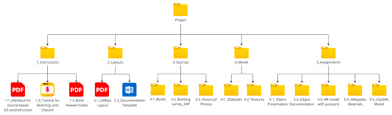 A structure consisting of five folders is specified for the student projects. The first folder contains a handout that uses the case study of the former synagogue in Speyer in 1250 to describe in detail the procedure for 3D reconstruction, documentation, and publication according to the SRM method [7]. In addition, tutorials for the semantic enrichment of the 3D models in Sketchup using the add-on CityEditor (enabling CityGML export) are provided here. The second folder contains template files for the postcard with the augmented reality application as well as a Word template for the documentation of the sources used and the 3D reconstruction process. In the third folder, the structure for storing the sources is presented, separated into literature, plans, and image material. The fourth folder contains the 3D models created and the textures used. The fifth folder is for the accompanying results, in which an object presentation, documentation, the designed postcard, the edited Wikipedia article, and the semantically enriched 3D model in CityGML data exchange format can be stored.