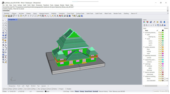 The SRM method is based on several work packages (see Figure 2), developed within research projects at the Hochschule Mainz and applied in the educational courses at the Warsaw University of Technology [3,4]. In the following, the SRM for application in education is presented using the example of one of a total of nine wooden synagogues reconstructed in the summer term of 2022. The synagogue in Wołpa (Belarusian: Вoўпа) was modelled, documented, and published by Katarzyna Prokopiuk under the supervision of the authors of the paper. The following introduction of the SRM methodology for the Wołpa Synagogue will serve as our case study. This paper was first presented at the Cultural Heritage and New Technologies Conference in Vienna in November 2022.