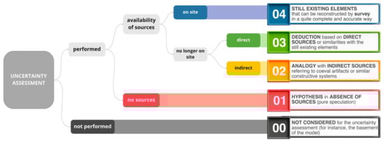 Not only at a cultural level, but also at a technical one, uncertainty data should be shareable and, hopefully, both human- and machine-readable. For this reason, each category of the proposed scale is also associated with a progressive value, represented by numbers 0–4 to be integrated into documentation. These features can be applied to the entire model or to each element composing it, according to its level of detail and semantic segmentation.