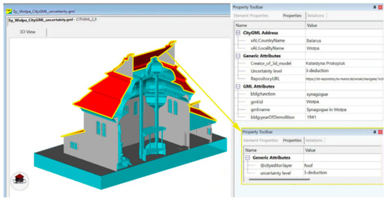 Visualisation of the model in the FZK Viewer 6.5.1. (software tool for the visualisation of semantic data models from the fields of BIM (Building Information Modeling) and GIS (Geographic Information Systems). The illustration shows, among other properties, the assigned uncertainty level value for both the entire synagogue and its roof using CityGML.
