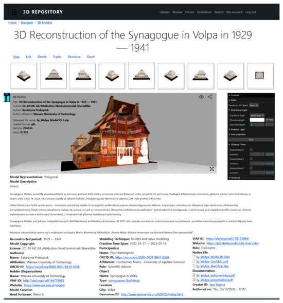 The data regarding virtual reconstruction of synagogue of Volpa prepared by Katarzyna Prokopiuk during student seminar at Faculty of Architecture at Warsaw University of Technology with collaboration with AI MAINZ is published in open-acceses 3d repository: https://3d-repository.hs-mainz.de/wisski/navigate/1626/view, accessed on 11 September 2024. The results of the surveys are available online: Bajena, I. (2024). Compilation of data collected in surveys on the WissKI-based 3D Repository with DFG 3D-Viewer project partners and architecture students from the Warsaw University of Technology and the Technical University of Łódź [Data set]. Zenodo. https://doi.org/10.5281/zenodo.13847404.