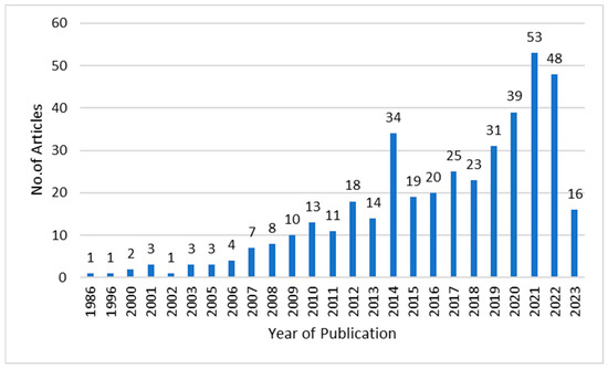 The researchers identified trends and patterns in academic production over time by categorizing and analyzing articles published from 1986 to 2023 (RQ1). The starting year of 1986 is based on the first article on museum visitors’ experiences by [57] on museums and the tourist experience (Figure 2).