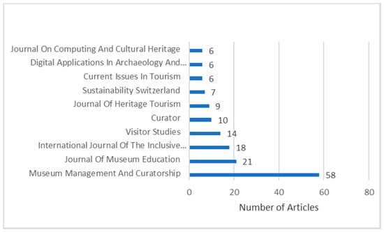 The distribution of journal articles from various publishers indicates that many of them are disseminated across different publishing platforms. There is a noticeable trend in publishing studies on museum visitor experiences in multidisciplinary journals. The recent rise of major publishers such as the Journal of Computing and Cultural Heritage and Digital Application in Archaeology and Cultural Heritage is directly associated with technological advancements. This emergence has led to subsequent studies on the application of technology in museums and its impact on museum visitors’ experiences.