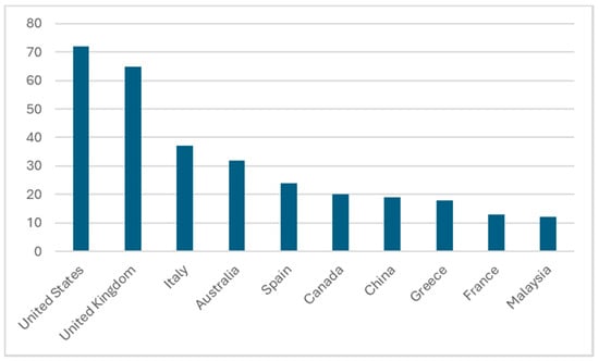 Among the four hundred seven (407) articles analyzed, 312 were affiliated with the top ten contributing countries, as displayed in Figure 4. In total, the articles had affiliations with 62 countries. The United States (72 articles) and the United Kingdom (65 articles) lead the number of articles published on museum visitors’ experiences, while contributions from Asian and African countries are notably fewer.